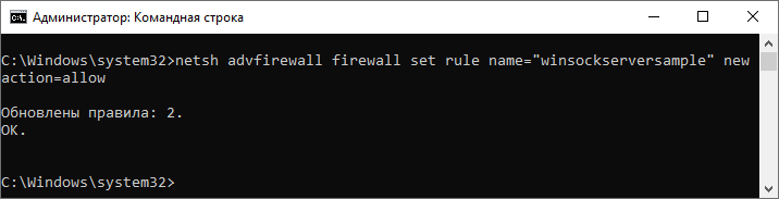 netsh advfirewall firewall set rule name="winsockserversample" new action=allow