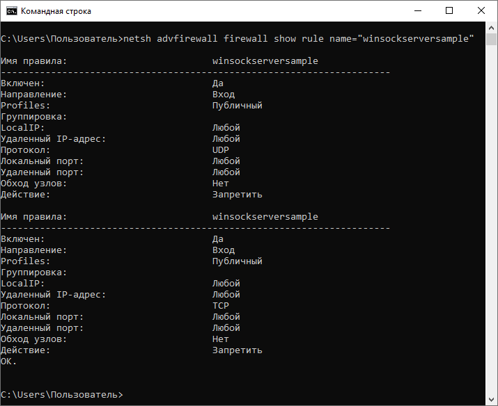 Используемая тут программа netsh очень многофункциональная. У нее существует ряд так называемых «контекстов», то есть функциональных областей, в которых эта программа работает. В случае вышеприведенной команды используется контекст netsh advfirewall firewall, который как раз касается работы с правилами «Брандмауэра Защитника Windows». Часть show rule команды означает, что мы хотим отобразить правила брандмауэра в окне консоли. Часть name="winsockserversample.exe" команды служит для фильтрации правил брандмауэра по имени отслеживаемой программы.