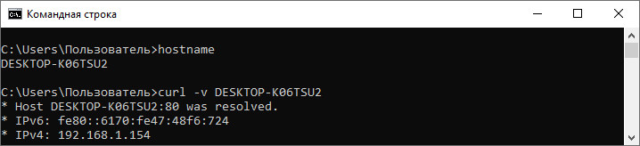 Для получения имени вашего узла (компьютера), под которым ваш компьютер известен в рамках вашей локальной сети, можно из командной строки использовать команду hostname. И тут же можно посмотреть соответствующие IP-адреса с помощью программы curl. Вот как это выглядит у меня на компьютере: