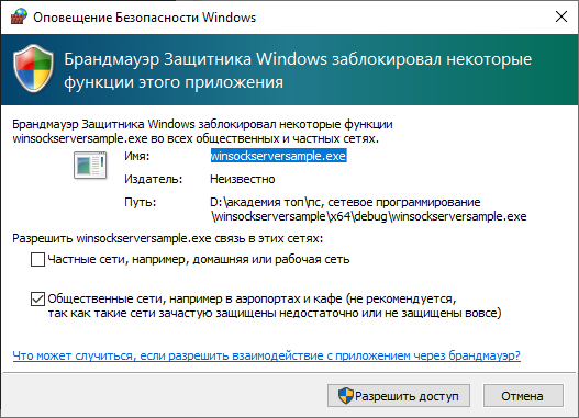 Однако, при первой же попытке запустить наш TCP-сервер (слушающий сокет, ожидающий входящие TCP-соединения) брандмауэр среагировал и выдал следующее окно с заголовком «Брандмауэр Защитника Windows заблокировал некоторые функции этого приложения»:
