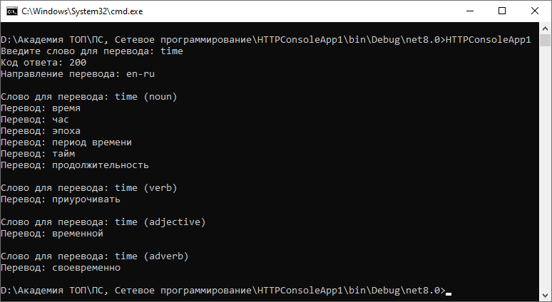 Написали со студентами на занятиях по предмету «Сетевое программирование» консольную программу (веб-клиент) на языке C#, использующую API «Яндекс.Словаря» (https://yandex.ru/dev/dictionary). Мы работаем на компьютерах с операционной системой «Windows 10».